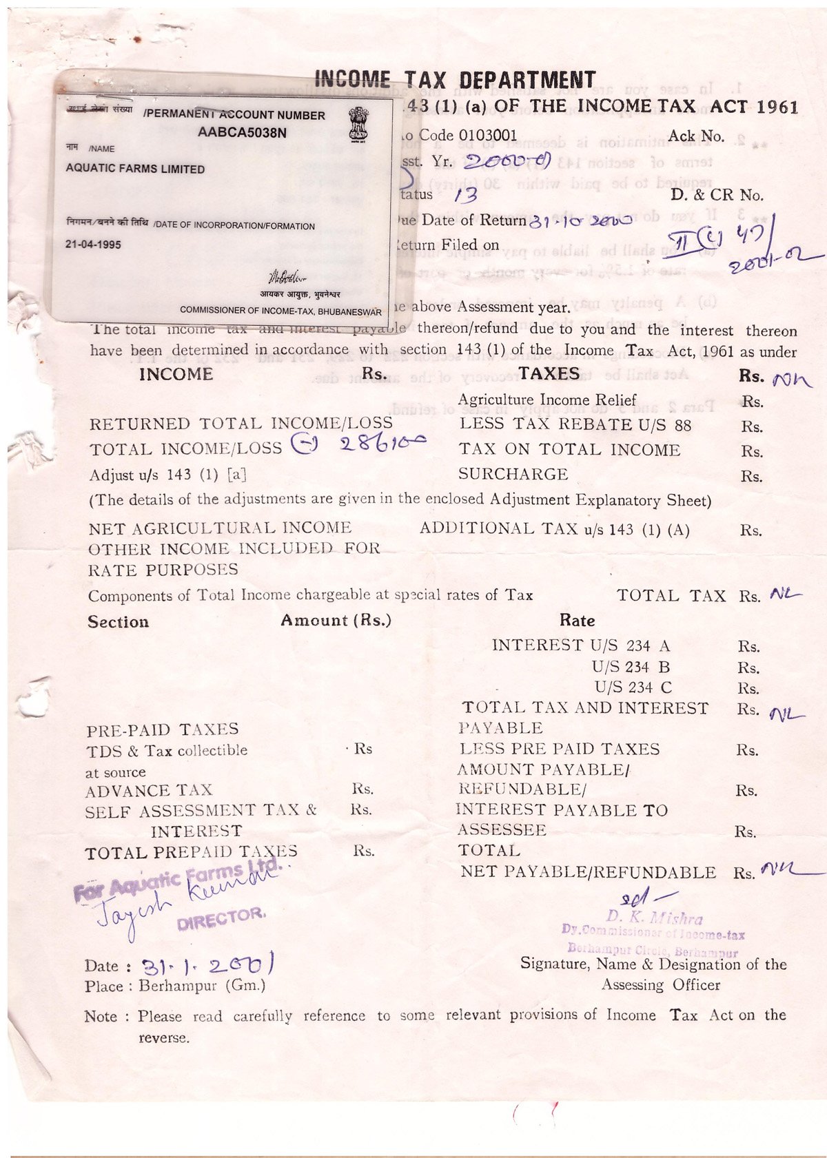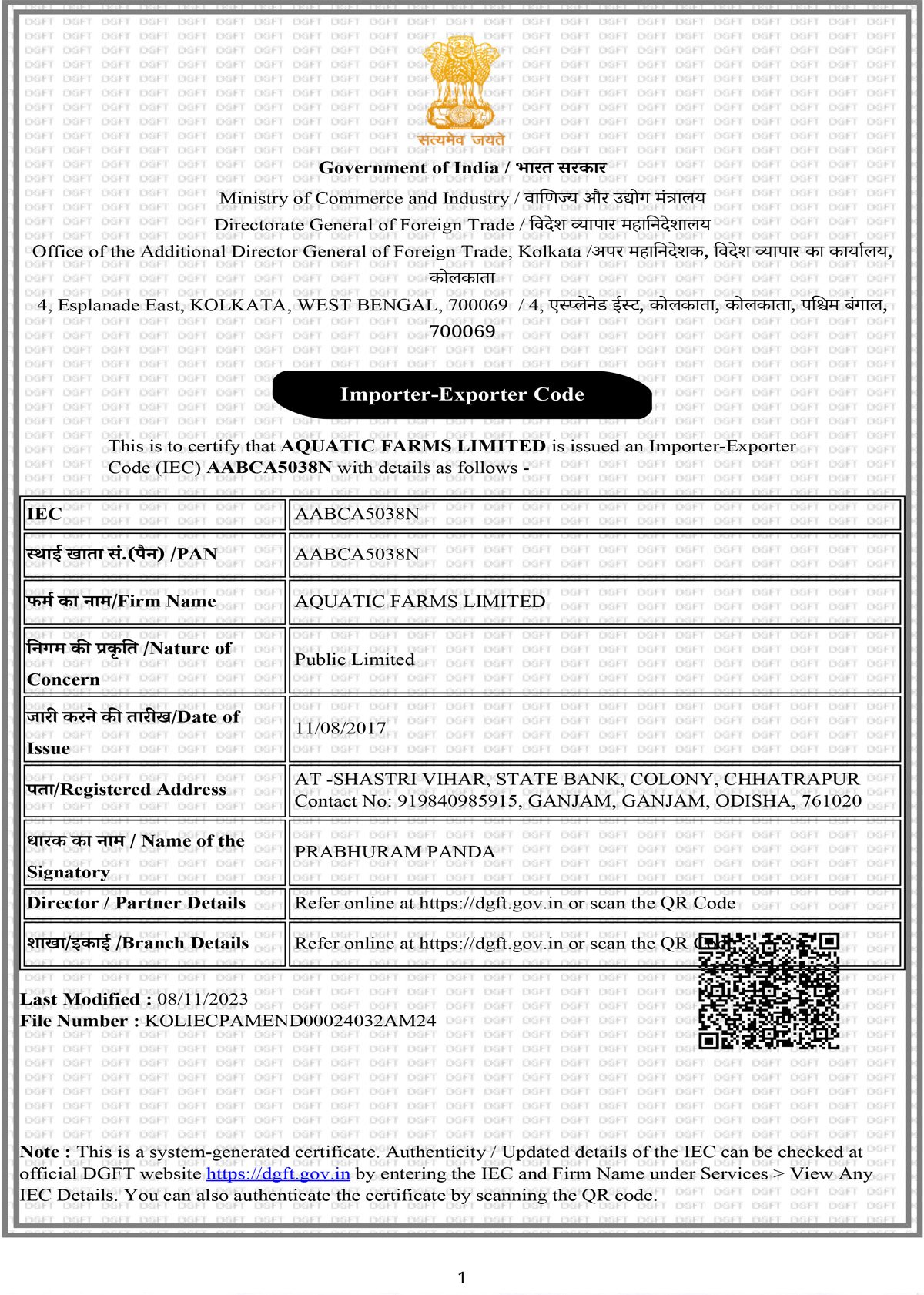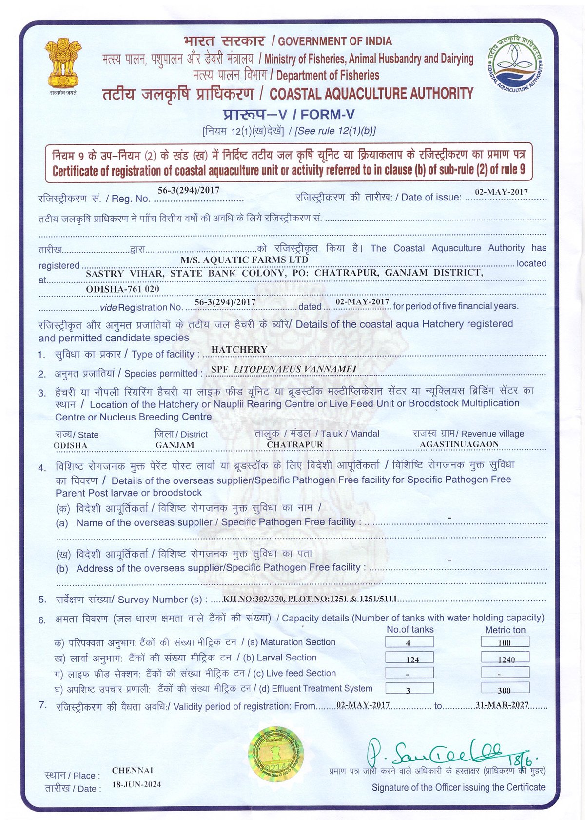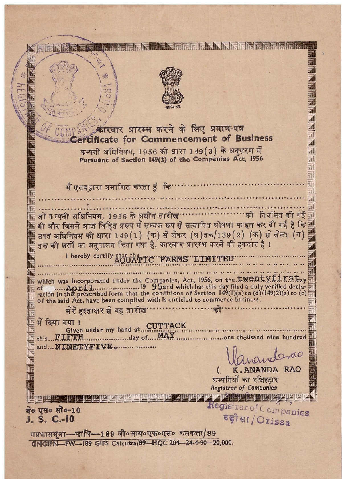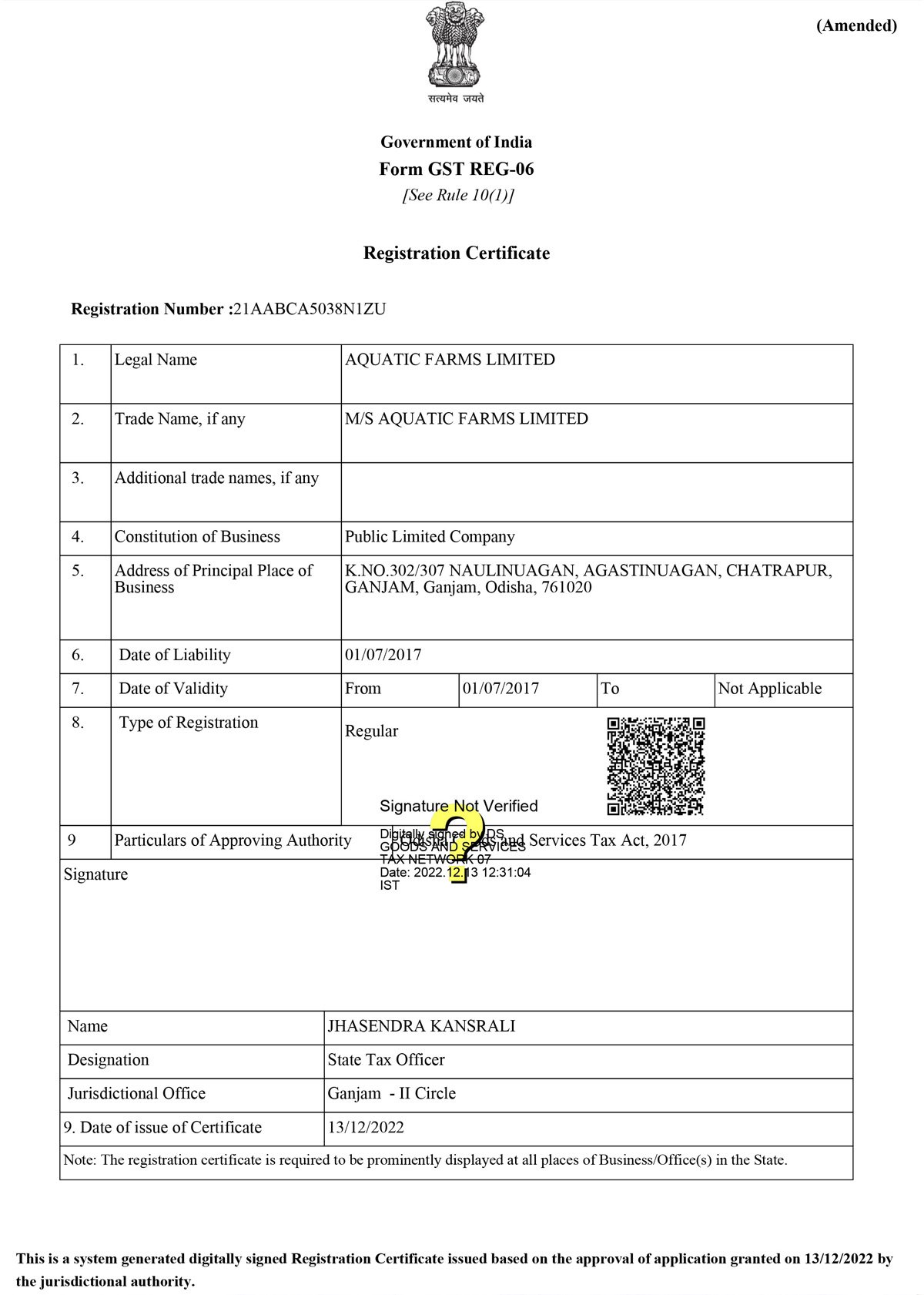 Aquatic Farms Limited is a trusted leader in the wholesale of agricultural raw materials, live animals, food, beverages, and tobacco. Established on April 21, 1995, our company has built a solid reputation over nearly three decades for quality, reliability, and innovation. Headquartered in Chhatrapur, Odisha, we are dedicated to serving the agricultural and aquaculture sectors with excellence.